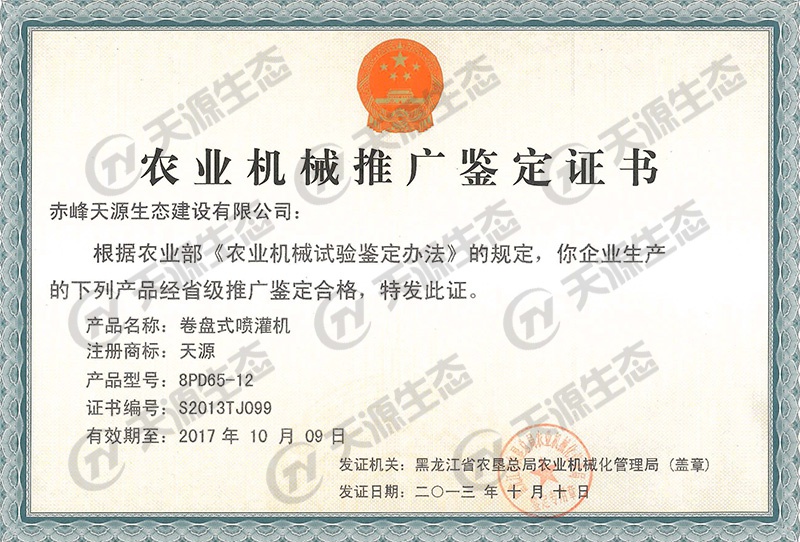 卷盘式喷灌机鉴定证书