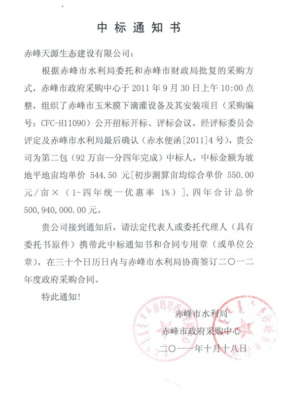 赤峰市政府采购中心于2011年9月30日,组织了赤峰市玉米膜下滴灌设备及其安装项目招标会议。经评标委员会评定及赤峰市水利局最后确认,赤峰天源生态建设有限公司为第二包中标人,中标总金额合计5亿元。